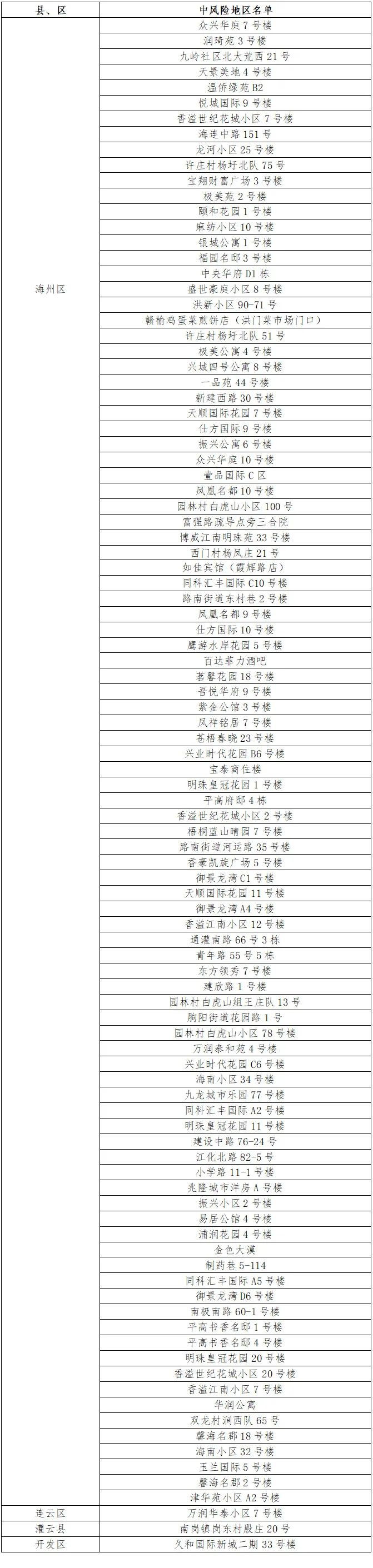 根據國務院聯防聯控機制有關規定,經綜合評估研判,市指揮部決定,自發布之日起,將海州區明珠皇冠花園20號樓、香溢世紀花城小區20號樓、香溢江南小區7號樓、華潤公寓、雙龍村澗西隊65號、馨海名郡18號樓、海南小區32號樓、玉蘭國際5號樓、馨海名郡2號樓、津華苑小區A2號樓調整為中風險地區。 其他地區風險等級不變。調整后全市現有99個中風險地區。 連云港市突發新冠肺炎疫情 應急處置指揮部辦公室 2022年3月14日 連云港市中風險地區(99個) (2022年3月14日)