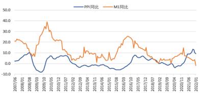 圖1 M1、PPI當(dāng)月同比增速走勢(shì)