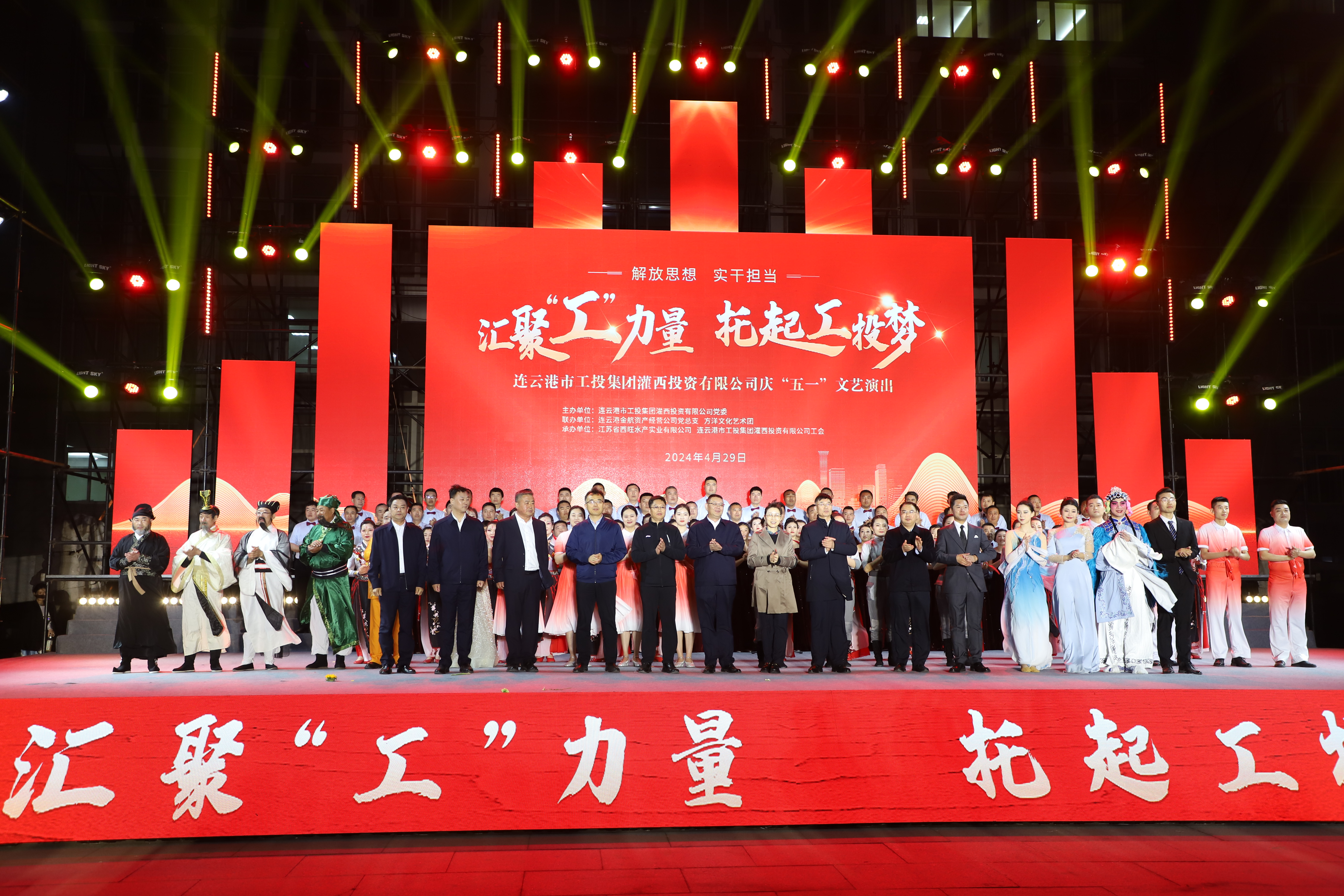 4月29日晚,灌西投資公司《匯聚“工”力量,托起工投夢》慶“五一”文藝演出在機關大樓前廣場舉行。本次活動由灌西投資公司黨委主辦,連云港金航資產經營公司黨總支、方洋文化藝術團聯辦,旨在通過藝術的形式,營造崇尚勞模、學習先進、尊重勞動的良好氛圍,豐富公司員工的文化生活,激發干事創業熱情。集團公司領導張六林、戴鴻鳴、汪群及部分部門負責人,灌西、金航資產經營公司領導班子成員出席演出活動,縣臨港產業區管委會、華能灌云清潔能源發電責任有限公司、徐圩新區方洋集團等有關領導受邀觀看演出。