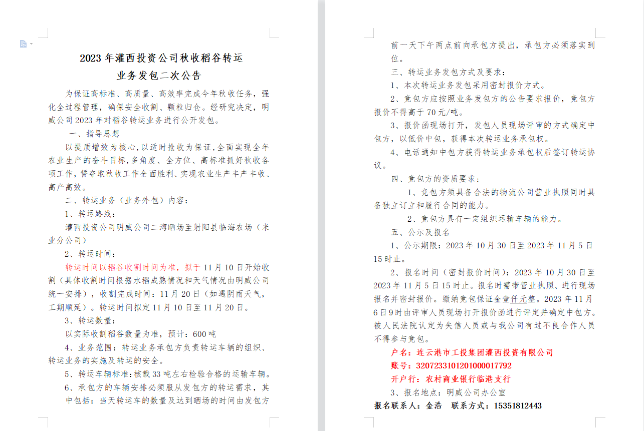 2023年灌西投資公司秋收稻谷轉(zhuǎn)運 業(yè)務(wù)發(fā)包二次公告