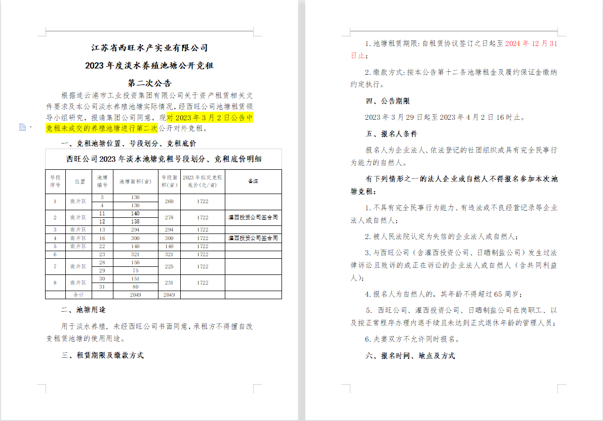 江蘇省西旺水產(chǎn)實(shí)業(yè)有限公司2023年度淡水養(yǎng)殖池塘公開競租第二次公告