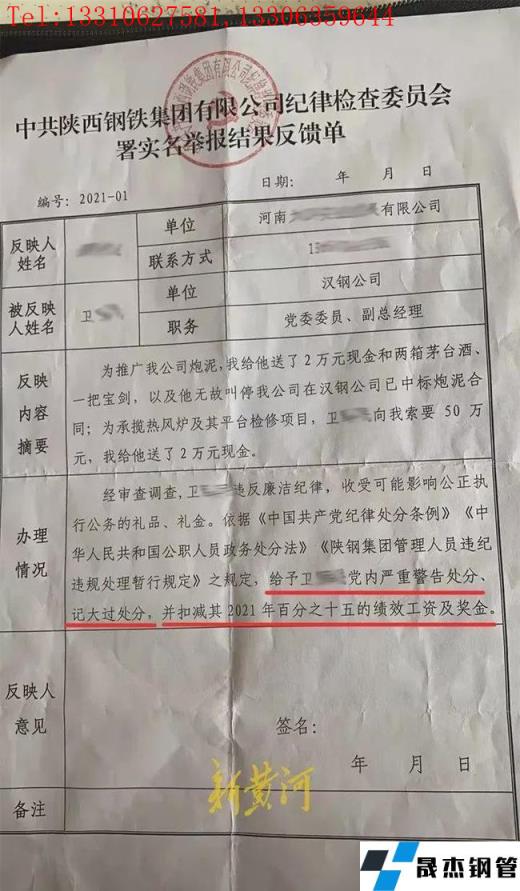 2021年4月,針對衛某主動索賄、受賄一事,王木生向陜西省國資委、漢中市紀檢委等部門進行了實名舉報。11月18日,新黃河記者了解到,陜鋼集團紀委已對衛某下達了處理結果:給予衛某記大過及黨內嚴重警告處分,并扣減2021年15%的績效工資及獎金。紀委工作人員表示,對衛某已經按照相關規定進行了內部處理,所收的相應贓款也已經沒收。