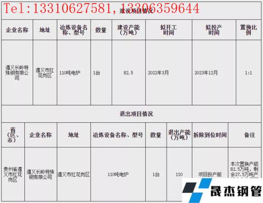 2022年1月4日,遵義市工業和能源局發布遵義長嶺特殊鋼有限公司產能置換方案,方案公示期為2022年1月4日至2022年1月29日。方案顯示,遵義長嶺特殊鋼有限公司擬于2022年3月新建110t電爐1座,產能82.5萬噸/年,預計2023年12月投產。同時退出110t電爐1座,產能110萬噸/年,于項目投產前拆除。
