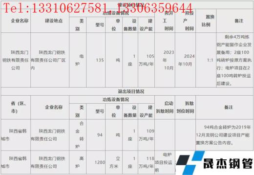 12月24日,陜西省工信廳發布陜西龍門鋼鐵建設項目產能置換調整方案。方案表明,陜西龍門鋼鐵擬于2023年10月在現場區內新建135t電爐1座,產能105萬噸/年,預計2024年10月投產。同時計劃退出94t合金轉爐1座,產能109萬噸/年;1280m3高爐1座,產能118萬噸/年,并于電爐項目投運前拆除到位。