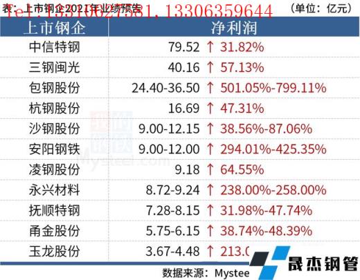 免責聲明:本網站(山東聊城晟杰無縫鋼管廠www.subnucleon.com)刊載的“2021年鋼企利潤創新高,中信特鋼實現凈利近80億”等均源于網絡,版權歸原作者所有,且僅代表原作者觀點,本文所載信息僅供參考。轉載僅為學習與交流之目的,如無意中侵犯您的合法權益,請及時聯系刪除。本網站刊登此篇文章并不意味著本站贊同其觀點或證實其內容的真實性,我們不對其科學性、嚴肅性等作任何形式的保證。如果侵犯了您的版權,請盡快聯系我們予以撤銷,謝謝合作!