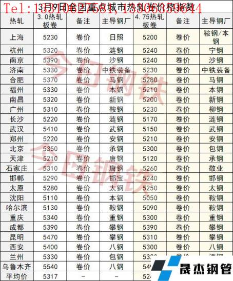 截至3月9日,全國主要城市3.0熱軋板卷均價5317元/噸,周環(huán)比上漲64元/噸;4.75熱軋板卷均價5241元/噸,周環(huán)比上漲63元/噸。以下為3月4日與3月9日全國重點(diǎn)城市熱軋板卷價格指數(shù)對比情況: