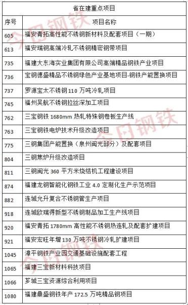 2022年2月25日,福建省發(fā)布《2022年重點項目名單》,其中共涉及三鋼、寶鋼、三寶鋼鐵、福建龍鋼、鼎盛鋼鐵等多個鋼企的二十個鋼鐵項目!在這20個項目中,僅不銹鋼項目就有9個,其中包括寶鋼德盛、福安青拓、寶太不銹鋼等龍頭企業(yè)提高產(chǎn)能規(guī)模、補齊鏈條短板的多個項目,而這也彰顯了福建以龍頭企業(yè)為主導(dǎo),以協(xié)作配套項目為依托,推動產(chǎn)業(yè)跨區(qū)轉(zhuǎn)移集聚和上下游聯(lián)動,打造千億不銹鋼產(chǎn)業(yè)集群的重要規(guī)劃。