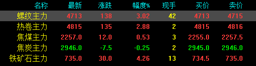 今日螺紋主力期貨漲138,收報4713,漲幅3.02%;熱卷主力漲135,收報4815,漲幅2.88%;焦煤主力漲12,收報2257,漲幅0.53%;焦炭主力跌7.5,收報2946,跌幅0.25%;鐵礦石主力漲30收報735,漲幅4.26%。