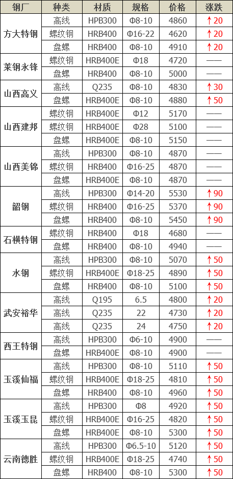 上調8家,占比61.5%,調價幅度20-90元/噸;
