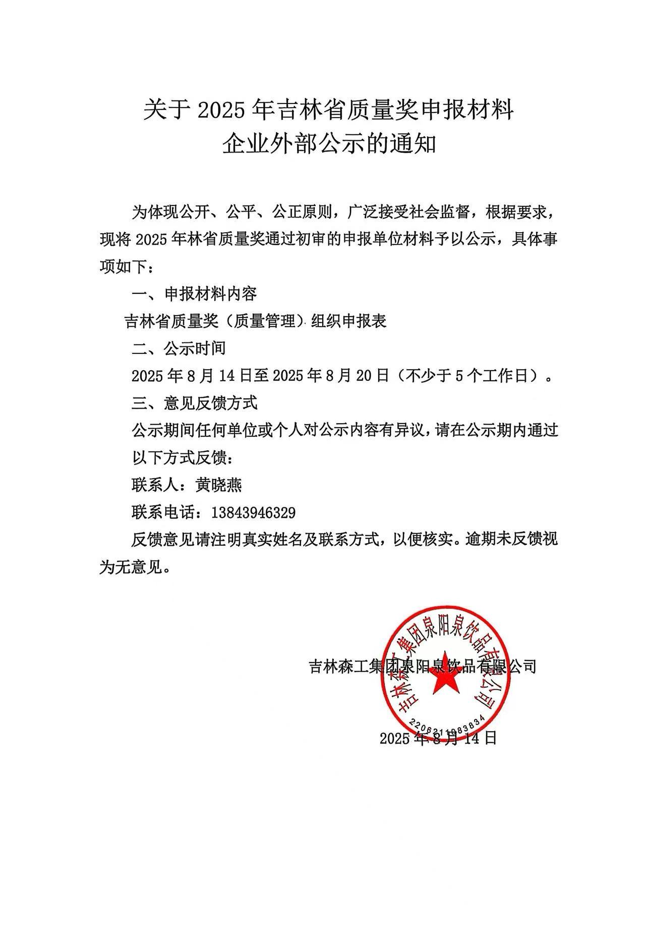 關于2025年吉林省質量獎申報材料企業外部公示的通知