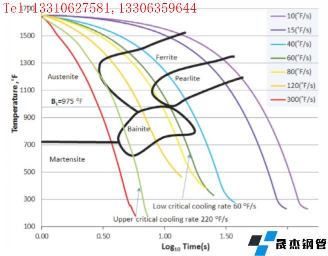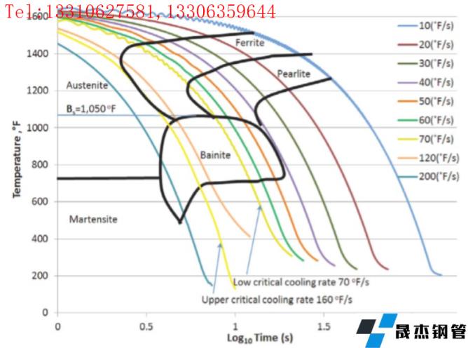 從圖6可以看出,當冷卻速率介于下臨界冷卻速率60°F/s(33.3℃/s)和上臨界冷卻速率220°F/s(122℃/s)之間時,奧氏體向針狀鐵素體和上貝氏體相變,貝氏體轉變的起始溫度為975℉(524℃)。