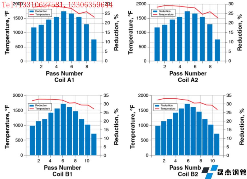 在加熱爐經過1.5小時加熱到1700℉,圖7顯示了每道次的壓下率和溫度,從圖可以看出,相同成分的鋼卷呈現出相同的溫度模式,因此,它們在Steckel軋機出口處的奧氏體晶粒尺寸非常接近。