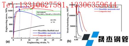 圖 3.復合鋼和參考整體鋼的工程應力-應變曲線 (a) 和相應的應變-硬化速率-應變曲線 (b)。注:UD、TD、UTS 和 YS 分別表示均勻延展性、總延展性、極限抗拉強度和屈服強度。