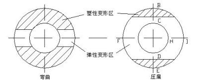 橫向壓扁及通過疊加橢圓壓扁變形來達(dá)到矯直的目的。在矯直截面中產(chǎn)生如圖8-9中BCDE的塑性區(qū)。這對矯直效果是非常重要的,因為彎曲矯直不能使截面全部為塑性區(qū),利用壓扁變形來補(bǔ)償。另外,對局部彎曲、管端彎曲、縱向彎曲矯直效果很差,必須是縱向彎曲和壓扁的共同作用才能達(dá)到滿意的矯直效果。(注:提高厚壁鋼管壁厚精度可提高厚壁鋼管的抗壓