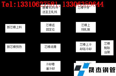5.2.5.1 芯棒循環工藝過程描述芯棒在預熱爐預熱后上線使用,芯棒從預熱爐出爐后,上鏈式移送機經潤滑站(出爐側)潤滑后于橫移小車東側擋板前定位,經推料機構及緩沖接料機構動作,經推料機構推動及撥叉撥動至芯棒傳送位,橫移小車接料鉤升起,將芯棒送至芯棒予穿線前,經撥叉翻至主軋線。