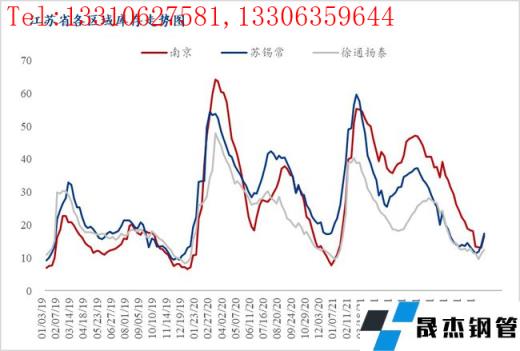 如上圖所示,2020年1月23日省會(huì)南京市場(chǎng)庫(kù)存占全省現(xiàn)貨庫(kù)存的21%左右,屬全年較低水平;而4月9日前后基本占全省庫(kù)存的41%;20年上半年南京市場(chǎng)庫(kù)存均保持較高水平,而下半年開(kāi)始庫(kù)存便逐漸走低,蘇錫常庫(kù)存累庫(kù)增加。2021年1月8日南京庫(kù)存占全省庫(kù)存的24%,從4月初開(kāi)始到本年度結(jié)束,南京庫(kù)存占比基本維持在40-42%左右,11月5日占比最高達(dá)到年度最高值,約50/%。2021年全年,南京市場(chǎng)庫(kù)存均保持較高水平,僅在年初階段,蘇錫常總庫(kù)存略高于南京。整體來(lái)看,今年南京市場(chǎng)現(xiàn)貨資源一直處于相對(duì)充裕的狀態(tài),且部分無(wú)縫厚壁鋼管廠(chǎng)家?guī)齑媲耙埔彩潜WC該市場(chǎng)建材供給較為穩(wěn)定的重要因素,而徐通揚(yáng)泰區(qū)域則因價(jià)格波幅巨大,市場(chǎng)參與者主動(dòng)囤貨意愿不高,全年庫(kù)存相較去年小幅減量。