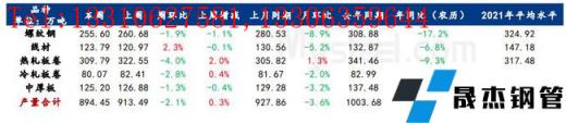 供應方面,本周五大厚壁無縫鋼管品種供應維持低位水平,降至894.45萬噸,降幅2.1%,其中建材環比減量2.3萬噸,降幅0.6%,板材環比減量16.78萬噸,降幅3.2%。