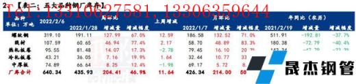 節后第一周五大品種庫存累增幅度如期加速,從日均增庫方面來說,建材和板材總庫存2022年春節期間分別日均增加41.49萬噸/天和6.27萬噸/天,同比去年分別下降19%和45%;五大品種無縫厚壁鋼管廠家庫存和社會庫存2022年春節期間分別日均增加18.58萬噸/天和27.32萬噸/天,同比去年分別下降28%和26%。由此可見,今年庫存累庫幅度和速度依然預期內低于去年同期水平。從后期庫存增幅預期來看,除2020年疫情影響累庫天數41天之外,2018年、2019年、2021年春節后累庫天數均在20天至21天,預計今年累庫天數將與此保持相對一致,累庫天數或受雨雪天氣影響略有延長,達到21至23天左右,峰值或在3月第二周期間出現。