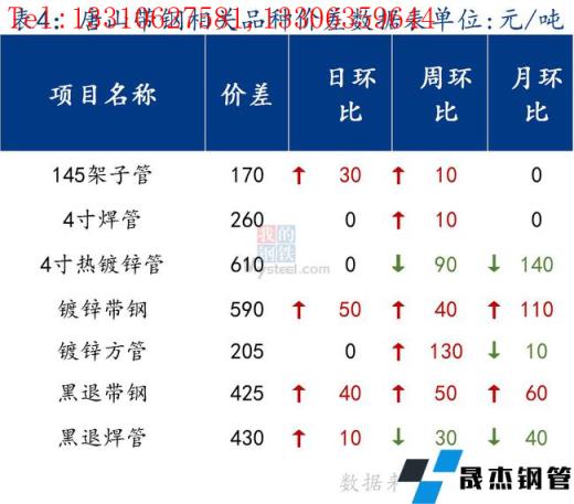 今日唐山管帶價格趨穩運行,其中355帶鋼穩,145帶鋼較昨日漲100元/噸,焊管、鍍鋅管價格穩。355帶鋼市場價格先漲后跌,較昨日整體趨穩運行。受今日黑色系期貨沖高回落影響,市場心態發生變化,對價格偏觀望,謹慎操作為主,成交清淡。