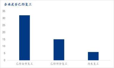 2、截止調(diào)研日,已經(jīng)有超過88.68%的企業(yè)完全復工或部分復工,未復工的企業(yè)也將在未來1-2周之內(nèi)復工;復工企業(yè)當中基本都已正常生產(chǎn),只有5.7%企業(yè)延遲1-2周恢復到正常生產(chǎn)狀態(tài);