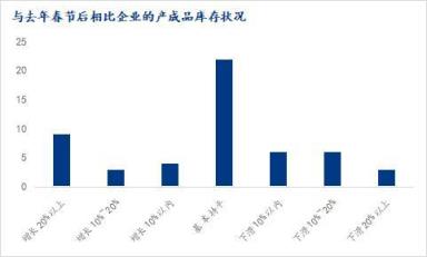 調(diào)研樣本企業(yè)中,相比去年春節(jié)后產(chǎn)成品庫存方面,增長20%以上的企業(yè)占比16.98%,增長10%-20%的企業(yè)占比5.66%,增長10%以內(nèi)的占比為7.55%;與去年持平的企業(yè)占比41.5%;下滑10%以內(nèi)的企業(yè)占比11.32%,下滑10%-20%的企業(yè)占比11.32%,下滑20%以上的企業(yè)占比5.66%。