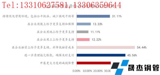 8、對于2022年發(fā)展前景預(yù)期偏謹(jǐn)慎。本次調(diào)研樣本企業(yè)中對2022年發(fā)展前景預(yù)期持樂觀或比較以及非常樂觀的企業(yè)占比57.58%,不太樂觀或比較悲觀的企業(yè)占比為33.33%,因此對于未來一段時間的投入情況,持適當(dāng)或大規(guī)模增加的企業(yè)占比為46.46%,暫不增加投入的占比為43.43%,適當(dāng)縮減或退出部分業(yè)務(wù)的企業(yè)占比為10.10%,由此看來,目前整體經(jīng)濟(jì)環(huán)境的確面臨一定壓力,導(dǎo)致企業(yè)信心相對保守,而主要原因是經(jīng)濟(jì)下行壓力下,穩(wěn)增長政策力度不夠。企業(yè)希望得到政府的支持與改進(jìn)的呼聲最大的是開展更大力度的減稅降費以及降低融資成本,進(jìn)一步清理拖欠賬款,確保及時支付,持續(xù)優(yōu)化營商環(huán)境,公平執(zhí)法、減少微觀干預(yù)。
