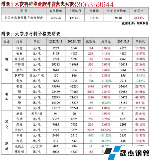 免責聲明:本網站(山東聊城晟杰無縫鋼管廠www.subnucleon.com)刊載的“MRI:大宗原材料價格周報(2月7日-2月11日)”等均源于網絡,版權歸原作者所有,且僅代表原作者觀點,本文所載信息僅供參考。轉載僅為學習與交流之目的,如無意中侵犯您的合法權益,請及時聯系刪除。本網站刊登此篇文章并不意味著本站贊同其觀點或證實其內容的真實性,我們不對其科學性、嚴肅性等作任何形式的保證。如果侵犯了您的版權,請盡快聯系我們予以撤銷,謝謝合作!