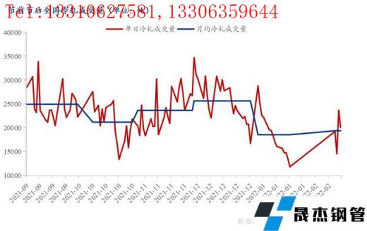 2022年2月17日(農歷正月十七)全國162家冷軋成交量為20073噸,年后成交量最高值23649噸,周度平均成交量為19378噸,與9月份以來最低月均成交量21184噸相比,降幅為8%左右,可見當期市場需求并未完全開啟。并且多數商家表示,除個別天數達到正常成交外,其余基本在正常5-6成水平。