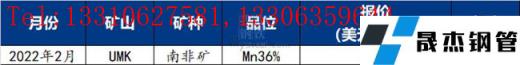 UMK2022年3月對華錳礦裝船報價Mn36南非半碳酸4.7美元/噸度,環比上漲0.2美元/噸度。