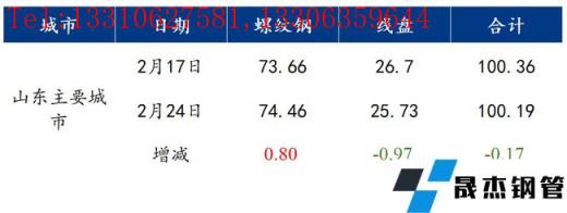 本周山東13個(gè)主要城市建筑厚壁無縫鋼管總庫(kù)存100.19萬(wàn)噸,較上周降低0.17萬(wàn)噸,較去年同期降低48.04萬(wàn)噸。其中,螺紋鋼74.46萬(wàn)噸,較上周增加0.8萬(wàn)噸,盤螺25.73萬(wàn)噸,較上周降低0.97萬(wàn)噸。