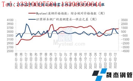 從圖1可以看出,21年和22年的冬儲期間,廢鋼價格隨著需求的擴(kuò)大出現(xiàn)了上漲,其實縱觀2021年1月至當(dāng)前的廢鋼價格走勢,可以看出其走勢與61家無縫厚壁鋼管廠家廢鋼的供需變化走勢有一定的關(guān)聯(lián)性。所以2022年1月以來廢鋼價格的走高,其中一個原因可以認(rèn)為是無縫厚壁鋼管廠家由于需要冬儲而導(dǎo)致的廢鋼需求增加,拉動了廢鋼價格的上漲。
