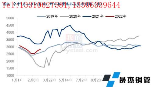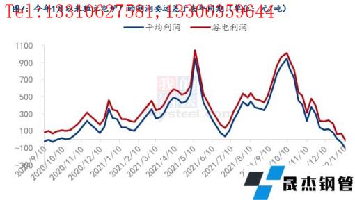 為什么廢鋼資源會存在階段性偏緊?其實在第一部分中已經(jīng)討論過,廢鋼資源近幾年內(nèi)都是在每年的1月到節(jié)后的一段時間內(nèi)存在著供需缺口,主要是因為廢鋼加工基地節(jié)前會放假,節(jié)后復(fù)工較晚導(dǎo)致的市場資源偏緊,無縫厚壁鋼管廠家因此在這段時間內(nèi)收廢較為困難,今年也不例外。但今年1月份61家無縫厚壁鋼管廠家的到貨量同比去年有所降低(圖4所示),到貨量同比有所降低,分析下來大概有三方面原因:一是由于產(chǎn)廢的制造業(yè)企業(yè)放假較早、房地產(chǎn)行業(yè)的走弱,使得社會加工廢鋼減少,外加疫情阻礙了廢鋼資源的流通,導(dǎo)致了廢鋼加工基地收廢困難。今年1月293家樣本基地庫存同比降低有30萬噸左右(圖5所示);二是今年1月以來五大材的總產(chǎn)量低于去年同期(圖6所示);三是電爐廠自今年1月以來普遍處于虧損的狀態(tài),利潤情況要遠(yuǎn)差于去年同期(圖7所示)。后面兩方面原因?qū)е铝藷o縫厚壁鋼管廠家降低了廢鋼消耗量,所以今年1月以來61家樣本無縫厚壁鋼管廠家的廢鋼日耗同比低于去年(圖8所示),需求端的走弱聯(lián)動了供應(yīng)端一起走弱。所以以上三方面原因綜合導(dǎo)致了今年1月份來無縫厚壁鋼管廠家收廢量不及去年同期。