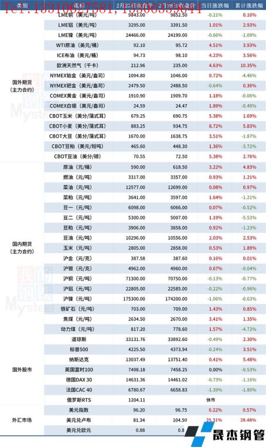 免責聲明:本網站(山東聊城晟杰無縫鋼管廠www.subnucleon.com)刊載的“受近期局勢影響大宗商品價格一覽表(2月28日)”等均源于網絡,版權歸原作者所有,且僅代表原作者觀點,本文所載信息僅供參考。轉載僅為學習與交流之目的,如無意中侵犯您的合法權益,請及時聯系刪除。本網站刊登此篇文章并不意味著本站贊同其觀點或證實其內容的真實性,我們不對其科學性、嚴肅性等作任何形式的保證。如果侵犯了您的版權,請盡快聯系我們予以撤銷,謝謝合作!