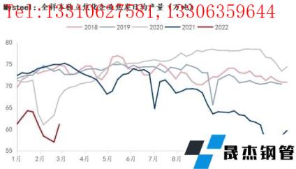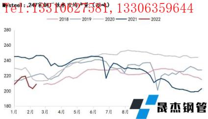 2月高爐產(chǎn)能利用率也呈現(xiàn)先降后增趨勢,2月底調(diào)研247家無縫厚壁鋼管廠家高爐煉鐵產(chǎn)能利用率77.61%,比1月底下降3.9%;2月底日均鐵水產(chǎn)量208.85萬噸,比1月底下降10.5萬噸,2月日均鐵水產(chǎn)量206萬噸,月環(huán)比下降10.59萬噸。2月由于冬奧會限產(chǎn),無縫厚壁鋼管廠家落實良好,鐵水產(chǎn)量出現(xiàn)明顯下滑,也是導致焦炭節(jié)后下調(diào)的核心因素,進入下旬后,隨冬奧會結束,無縫厚壁鋼管廠家復產(chǎn)預期強烈,且20日后復產(chǎn)兌現(xiàn)良好,需求支撐下,焦炭成功反彈。