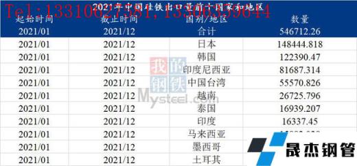 2021年1-12月硅鐵出口總量54.67萬噸,較去年增長97.77%。2021年1-12月硅鐵進口總量4.31萬噸,較去年增長88.05%;其中出口日本14.84萬噸,出口韓國12.23萬噸。