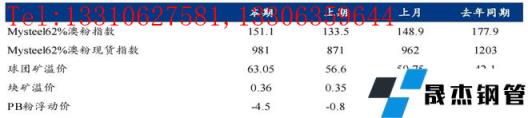 港口現貨與遠期現貨方面:本周五62%澳粉指數151.1美元/噸,環比增加17.6美元/噸;62%澳粉現貨指數981元/噸,環比增加110元/噸; 65%球團溢價指數為63.05美元/噸,環比漲6.45美元/噸; 62.5%塊礦溢價指數0.36美元/噸度,環比上漲0.02美元/噸度。本周PB粉遠期浮動溢價-4.5美元/噸,環比下跌3.70美元/噸。