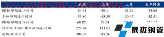 利潤方面:截至周五,青島港PB粉即期進口利潤-50.41元/噸,環比下降11.3元/噸;青島港卡粉即期進口利潤-54.8元/噸,環比下降9.3元/噸;青島港PB塊即期進口利潤68.87元/噸,環比下降7.76元/噸。本期河北地區無縫厚壁鋼管廠家螺紋噸鋼毛利潤271.44元/噸,環比增加150.4元/噸,廢鋼與鐵水價差284.26元/噸,環比收窄63元/噸。
