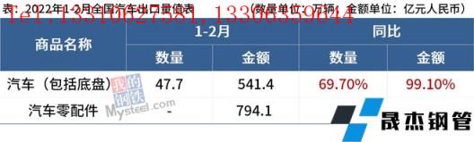免責聲明:本網站(山東聊城晟杰無縫鋼管廠www.subnucleon.com)刊載的“海關總署:1-2月中國出口汽車47.7萬輛,同比增69.70%”等均源于網絡,版權歸原作者所有,且僅代表原作者觀點,本文所載信息僅供參考。轉載僅為學習與交流之目的,如無意中侵犯您的合法權益,請及時聯系刪除。本網站刊登此篇文章并不意味著本站贊同其觀點或證實其內容的真實性,我們不對其科學性、嚴肅性等作任何形式的保證。如果侵犯了您的版權,請盡快聯系我們予以撤銷,謝謝合作!