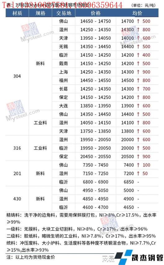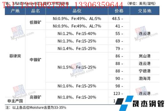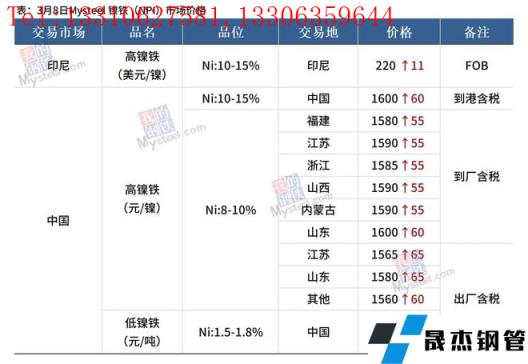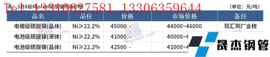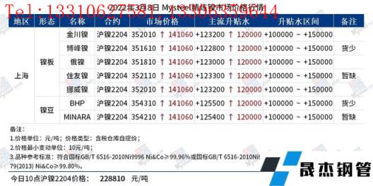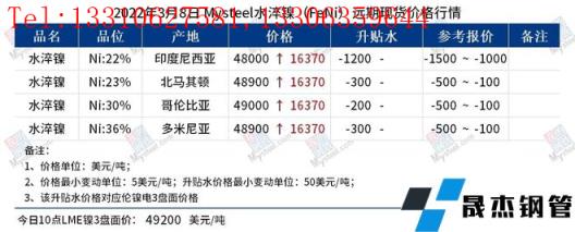 免責聲明:本網站(山東聊城晟杰無縫鋼管廠www.subnucleon.com)刊載的“鎳產業鏈價格(2022.3.8)”等均源于網絡,版權歸原作者所有,且僅代表原作者觀點,本文所載信息僅供參考。轉載僅為學習與交流之目的,如無意中侵犯您的合法權益,請及時聯系刪除。本網站刊登此篇文章并不意味著本站贊同其觀點或證實其內容的真實性,我們不對其科學性、嚴肅性等作任何形式的保證。如果侵犯了您的版權,請盡快聯系我們予以撤銷,謝謝合作!