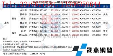 免責聲明:本網站(山東聊城晟杰無縫鋼管廠www.subnucleon.com)刊載的“鎳價極端行情之下 下游壓力凸顯”等均源于網絡,版權歸原作者所有,且僅代表原作者觀點,本文所載信息僅供參考。轉載僅為學習與交流之目的,如無意中侵犯您的合法權益,請及時聯系刪除。本網站刊登此篇文章并不意味著本站贊同其觀點或證實其內容的真實性,我們不對其科學性、嚴肅性等作任何形式的保證。如果侵犯了您的版權,請盡快聯系我們予以撤銷,謝謝合作!