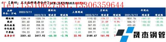庫存方面,五大品種厚壁無縫鋼管總庫存春節后連續首次全面去化,環比上周減少66.3萬噸,降幅2.7%。分品種看,建材庫存減少42.96萬噸,降幅為2.6%;板材庫存減少23.34萬噸,降幅3.2%;分指標看,五大品種無縫厚壁鋼管廠家庫存環比減少39.26萬噸,降幅6.2%;五大品種社會庫存環比減少27.04萬噸,降幅1.5%。