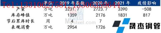 據(jù)樣本數(shù)據(jù)統(tǒng)計,以2020年疫情初發(fā)期間市場情況為例,以2019年數(shù)據(jù)為參考基數(shù)。受疫情影響,2020年春季樣本無縫厚壁鋼管廠家受疫情影響供給影響螺紋鋼產(chǎn)量508萬噸,同時春節(jié)后累庫周期增加3周,表觀消費減少1228萬噸,消費供給影響比約為2.42:1。