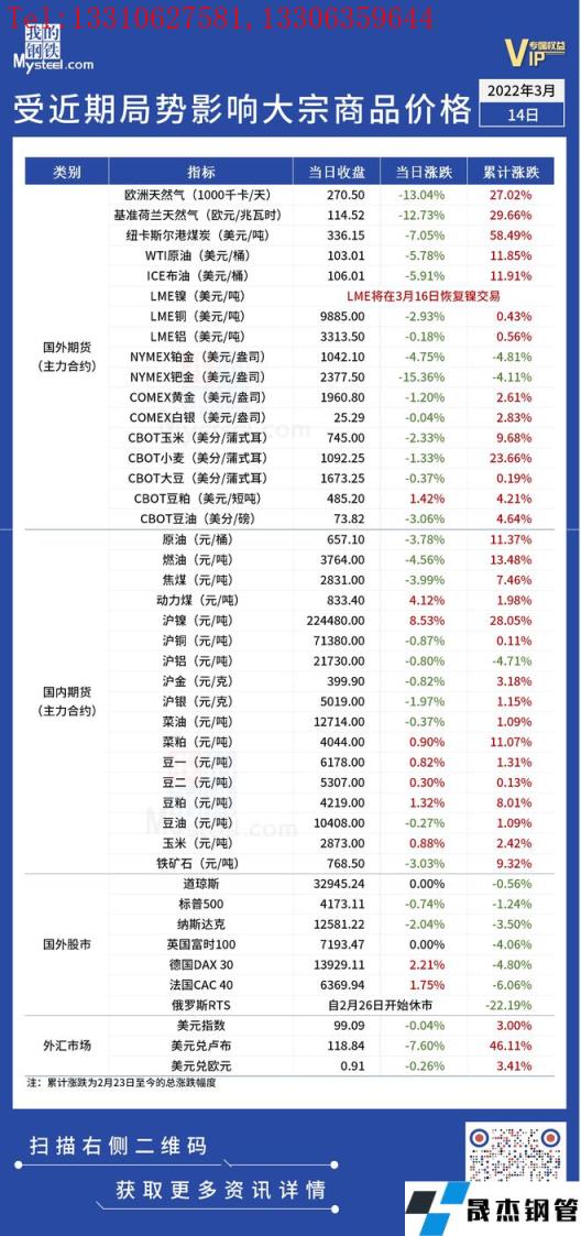 近期,受國(guó)際局勢(shì)影響,全球金融及大宗商品市場(chǎng)出現(xiàn)較大波動(dòng)。3月14日,能源價(jià)格繼續(xù)大幅回落。匯總情況如下: