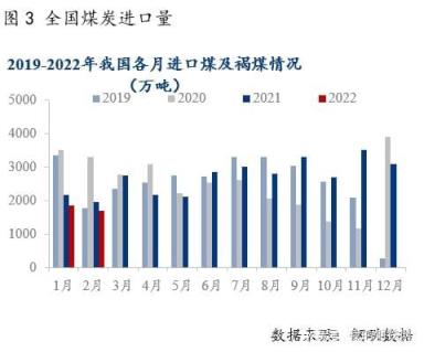 1-2月我國進口煤同環比大幅下降。2022年1-2月進口煤炭3539萬噸,同比下降14.0%,降幅比上年12月份收窄6.9個百分點。主要是受印尼1月煤炭禁止出口政策影響,影響1月下旬以及2月中上旬我國煤炭進口到港,疫情影響我國288口岸蒙煤通關量下降至100車左右,導致1-2月我國煤炭進口量同比大幅回落。2月下旬海外地緣沖突爆發,短期對我國進口有一定影響,對2月影響體現不大。