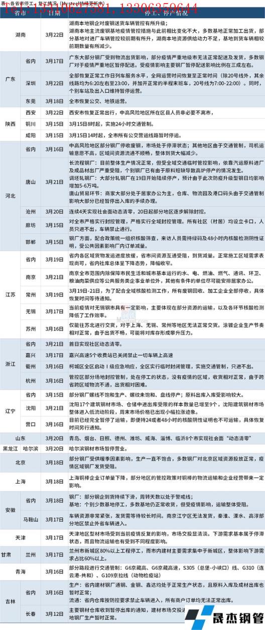 截至3月22日,匯總了16個省份停工復(fù)工最新信息。其中,湖南省本地鋼企對廢鋼送貨車輛管控有所升級;主流廢鋼基地疫情管控措施與此前相比變化不大,多數(shù)基地正常加工出貨,部分基地對進(jìn)廠車輛管控較前期有所升。唐山長流程無縫厚壁鋼管廠家目前整體生產(chǎn)情況正常,但受全域交通臨時管控影響,依靠汽運(yùn)原料進(jìn)廠及成品材出廠嚴(yán)重受阻,個別無縫厚壁鋼管廠家已有由于原料短缺導(dǎo)致高爐停產(chǎn)的情況發(fā)生。山東省已有青島、煙臺、日照、德州、濰坊、威海、淄博、臨沂8個市實(shí)現(xiàn)社會面“動態(tài)清零”。具體情況如下: