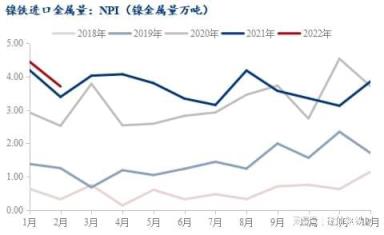 縱觀歷年來的中國鎳鐵進口數據,2月進口量均會存在環比下降的情況。今年2月環比減量高達20%,除了1月進口量太多,主因還是2月自然天數較少。雖然印尼鎳生鐵冶煉企業春節正常生產,但國內印尼鎳鐵進口貿易多處于假期狀態,月內進口量也隨之降低。