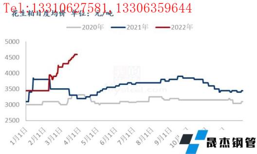 眾所周知,3月份豆粕價格持續偏強,多次創新高。花生粕價格在其帶動下強勢上漲,截至今日,花生粕均價為4600元/噸,相較春節前3450元/噸上漲1050元/噸,漲幅高達30.43%;與去年同期3500元/噸相比上漲1000元/噸,漲幅28.57%,創下近三年新高。而春節前由于花生油消費情況一般,油廠加工量較少,導致花生粕庫存低位運行,使其高價更加有所支撐,油廠見狀紛紛選擇提升壓榨量,也一定程度上帶動了原料花生的行情。但目前豆粕市場已逐步回歸理性,價格觸頂回落,花生粕價格隨之下行可能性較大。一旦影響到壓榨利潤,油廠的對花生的收購積極性也會下降,拖累花生價格。