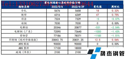 免責聲明:本網站(山東聊城晟杰無縫鋼管廠www.subnucleon.com)刊載的“家電原材料周報(5.2-5.6)”等均源于網絡,版權歸原作者所有,且僅代表原作者觀點,本文所載信息僅供參考。轉載僅為學習與交流之目的,如無意中侵犯您的合法權益,請及時聯系刪除。本網站刊登此篇文章并不意味著本站贊同其觀點或證實其內容的真實性,我們不對其科學性、嚴肅性等作任何形式的保證。如果侵犯了您的版權,請盡快聯系我們予以撤銷,謝謝合作!