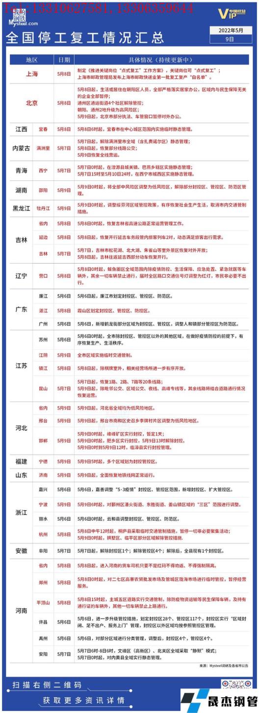 免責聲明:本網站(山東聊城晟杰無縫鋼管廠www.subnucleon.com)刊載的“疫情影響丨全國停工復工情況匯總(5月9日)”等均源于網絡,版權歸原作者所有,且僅代表原作者觀點,本文所載信息僅供參考。轉載僅為學習與交流之目的,如無意中侵犯您的合法權益,請及時聯系刪除。本網站刊登此篇文章并不意味著本站贊同其觀點或證實其內容的真實性,我們不對其科學性、嚴肅性等作任何形式的保證。如果侵犯了您的版權,請盡快聯系我們予以撤銷,謝謝合作!