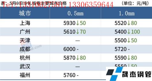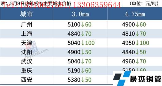熱軋板卷:5月9日,全國24個(gè)主要城市4.75mm熱軋板卷均價(jià)5067元/噸,較上個(gè)交易日下跌60元/噸。綜合來看,美聯(lián)儲(chǔ)加息和縮表落地限制了國內(nèi)貨幣寬松的空間,國內(nèi)多地區(qū)疫情爆發(fā),國內(nèi)外的雙重因素導(dǎo)致情緒不佳,無縫厚壁鋼管廠家目前面臨虧損的局面,焦煤焦炭的首輪提降已經(jīng)落地,原料端價(jià)格支撐進(jìn)行弱化,原料與成材呈現(xiàn)負(fù)反饋。預(yù)計(jì)下半年經(jīng)濟(jì)沖擊影響依舊,短期成材或?qū)⒕S持偏弱態(tài)勢(shì)。因此,預(yù)計(jì)全國熱軋板卷10日價(jià)格維持下行趨勢(shì)。